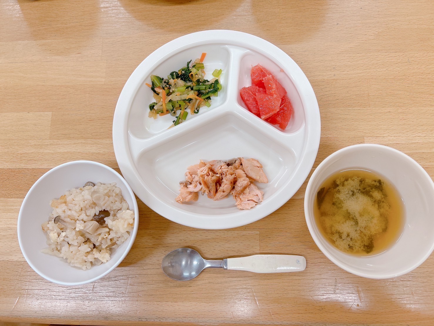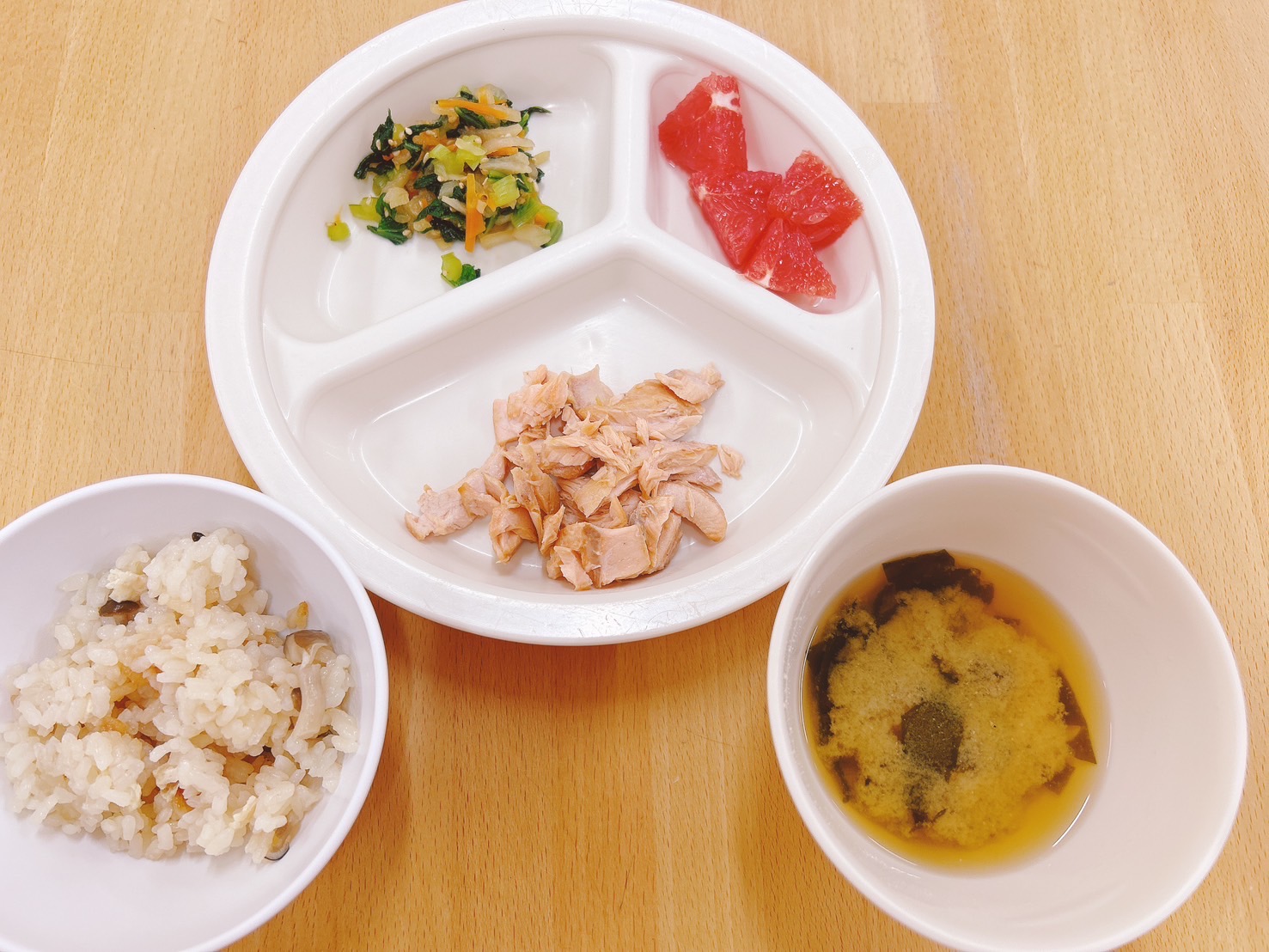 在園児向けのお知らせ 令和6年9月25日(水) 2024.09.25 🍚今日のお給食🍚 しめじごはん🍄🟫 鮭のみそ焼き 小松菜と切干大根の胡麻酢和え みそ汁(じゃがいも・わかめ) グレープフルーツ 《2歳児クラス》 《1歳児クラス》 《0歳児クラス》 《離乳食》 ⭐️今日の一枚!⭐️ 🍴チヂミ🍴 この記事のタイトルとURLをコピーする 令和6年9月24日(火) 前の記事 令和6年9月26日(木) 次の記事