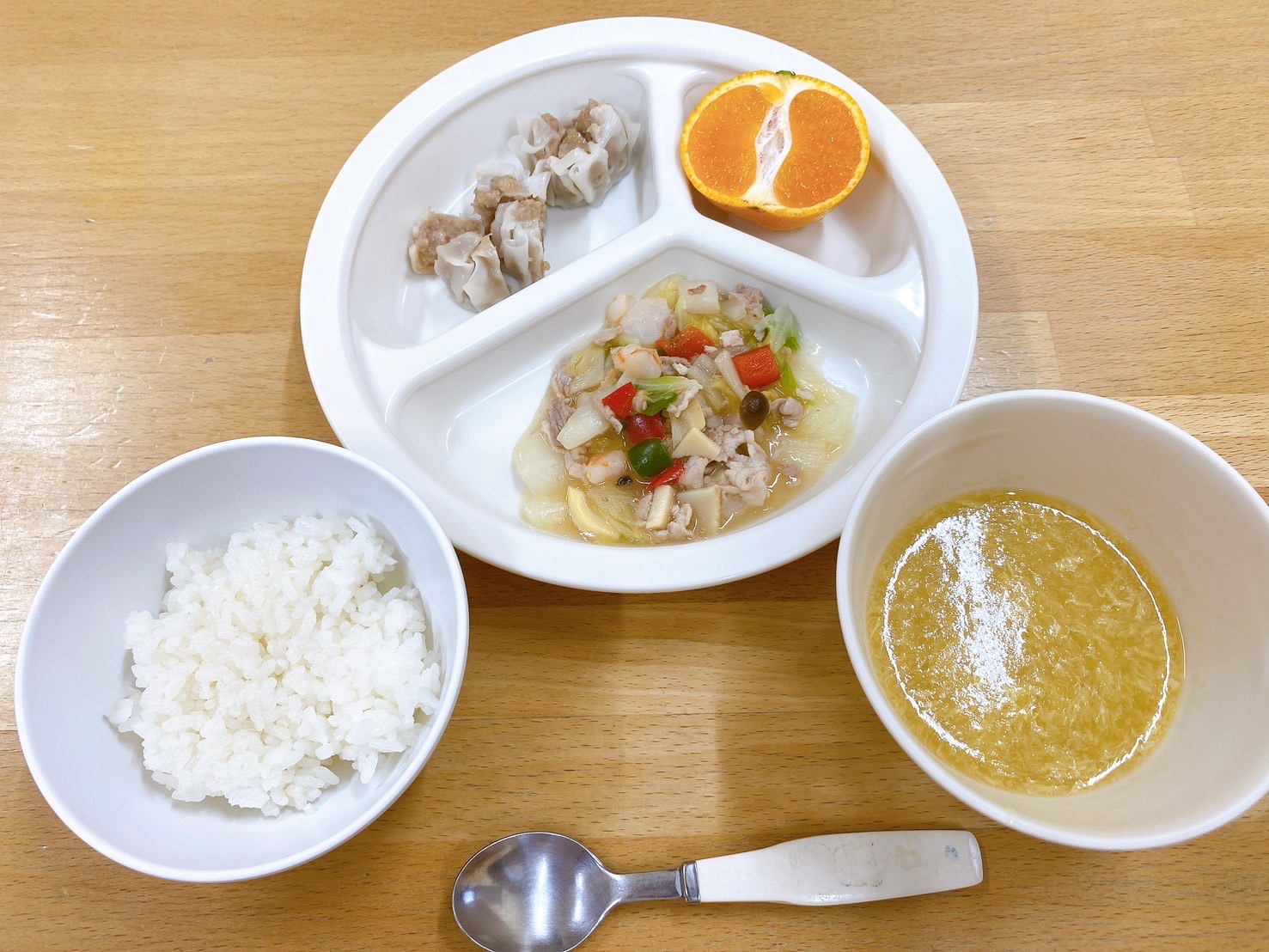 在園児向けのお知らせ 令和6年11月7日(木) 2024.11.07 🍚今日のお給食🍚 白飯 八宝菜 蒸ししゅうまい 中華風コーンスープ🌽 みかん🍊 《アレルギー除去》 🍎今日の一枚!🍎 🍒今日のおやつ🍒 ヨーグルト・菓子 この記事のタイトルとURLをコピーする 令和6年11月6日(水) 前の記事 令和6年11月8日(金) 次の記事