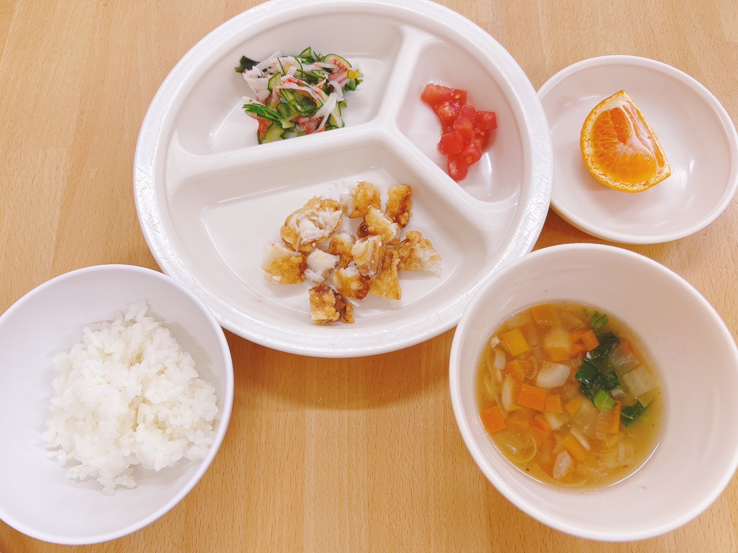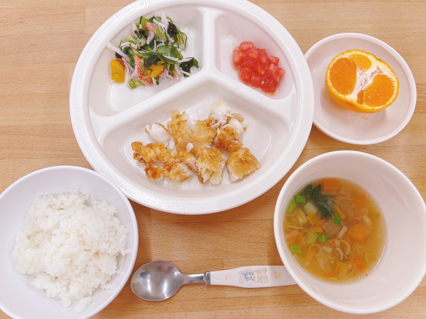 在園児向けのお知らせ 令和6年12月19日(木) 2024.12.19 🍚今日のお給食🍚 白飯 白身魚の竜田揚げ カットトマト🍅 酢の物 のっぺい汁 みかん🍊 《2歳児クラス》 《1歳児クラス》 《0歳児クラス》 🍎今日の一枚!🍎 🍒今日のおやつ🍒 りんごジュース・菓子 この記事のタイトルとURLをコピーする 令和6年12月18日(水) 前の記事 令和6年12月20日(金) 次の記事