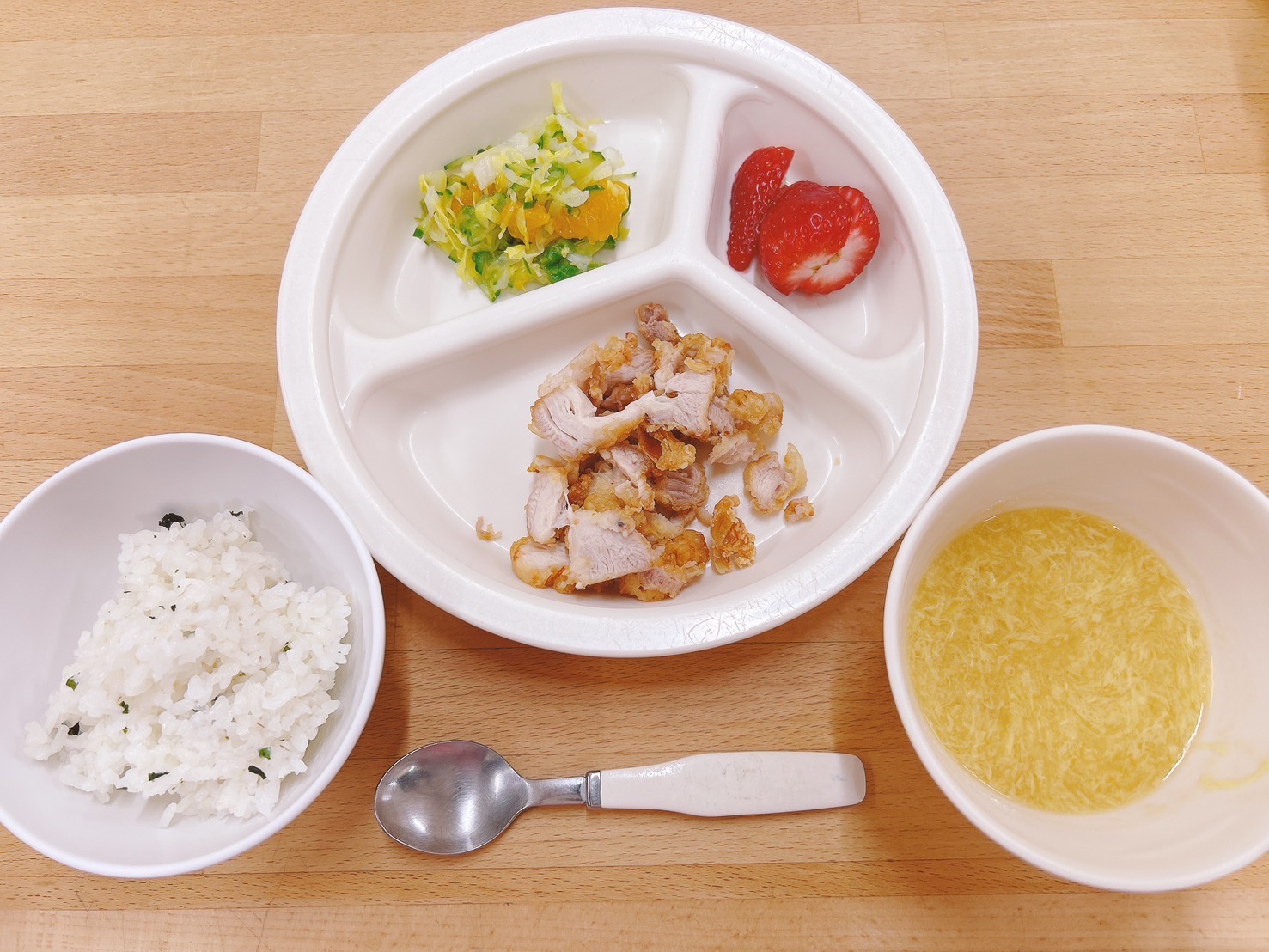 在園児向けのお知らせ 令和7年3月24日(月) 2025.03.24 🍚今日のお給食🍚 ⭐️今日はつばめ組さんのリクエストメニューです! わかめごはん とりの唐揚げ みかんサラダ🍊 中華風コーンスープ🌽 いちご🍓 🍎今日の一枚!🍎 🍒今日のおやつ🍒 バナナ・牛乳🍌 この記事のタイトルとURLをコピーする 令和7年3月19日(水) 前の記事 令和7年3月25日(火) 次の記事