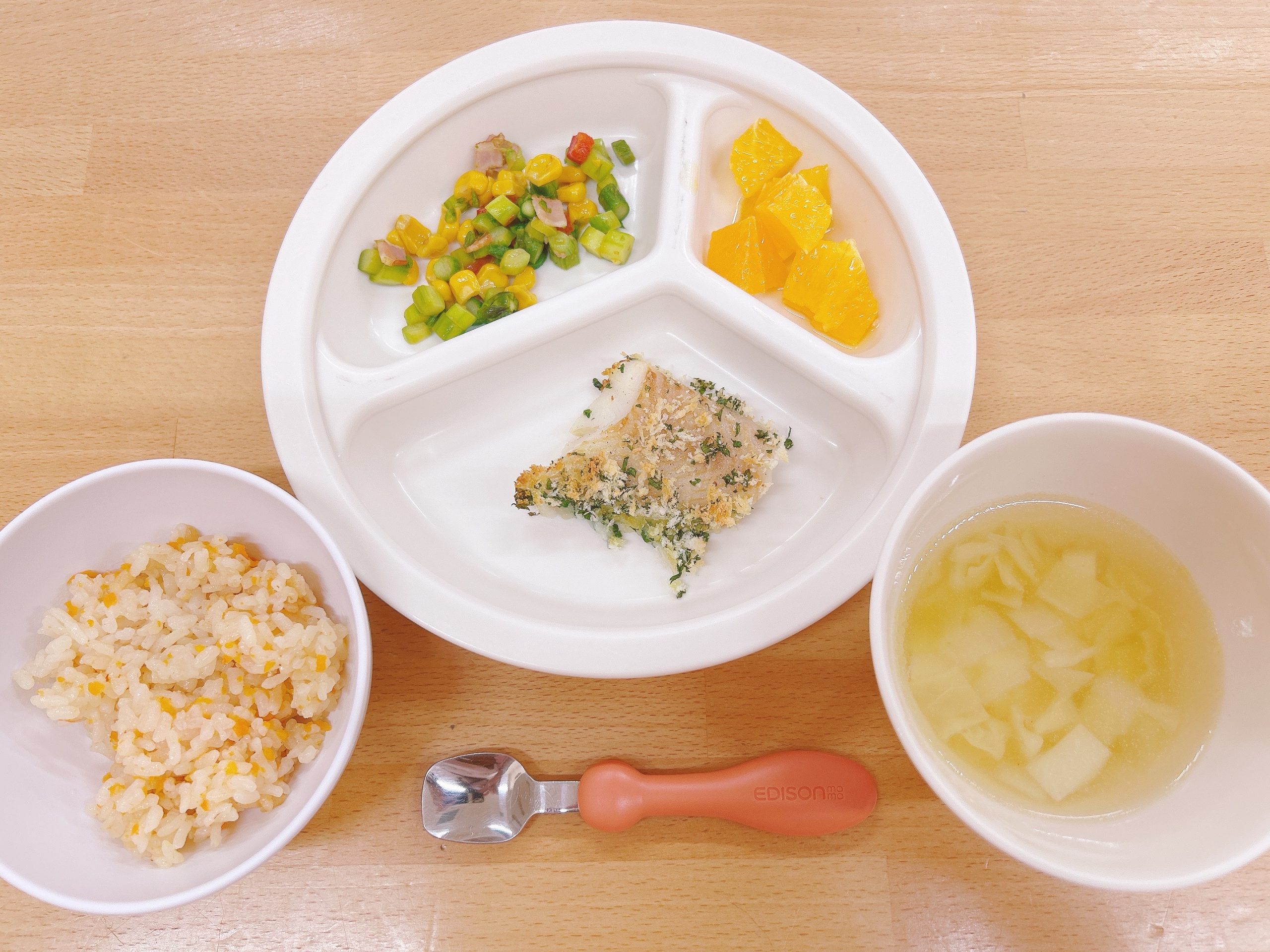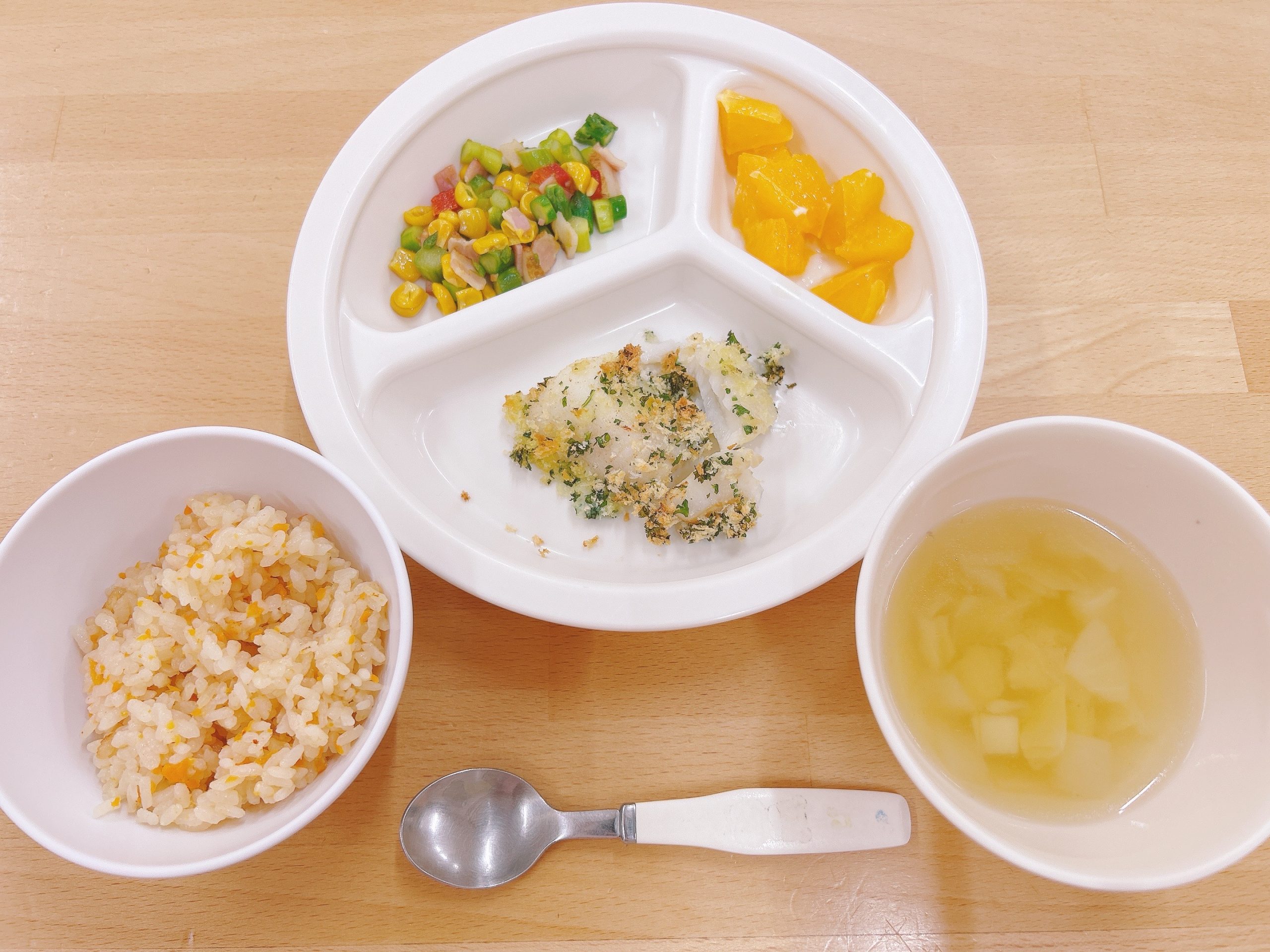 在園児向けのお知らせ 令和7年4月18日(金) 2025.04.18 🍚今日のお給食🍚 人参ごはん🥕 白身魚の香りパン粉焼き アスパラとコーンのソテー ポテトスープ 清見オレンジ🍊 《2歳児クラス》 《1歳児クラス》 🍎今日の一枚!🍎 🍒今日のおやつ🍒 揚げパン・牛乳 この記事のタイトルとURLをコピーする 令和7年4月17日(木) 前の記事 令和7年4月21日(月) 次の記事