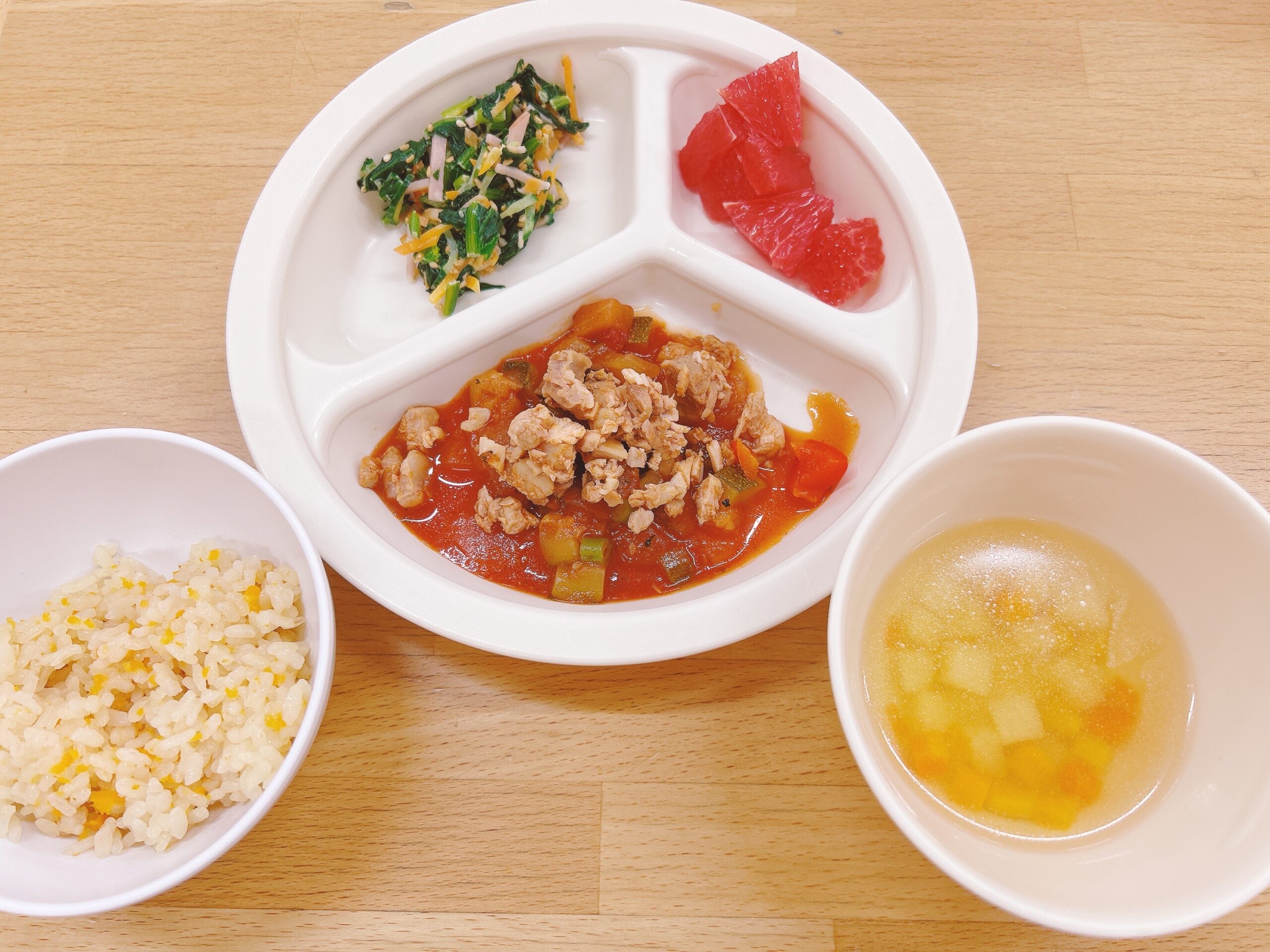 在園児向けのお知らせ 令和7年6月16日(月) 2025.06.16 🍚今日のお給食🍚 人参ごはん🥕 鶏肉と夏野菜のトマト煮 ポパイサラダ ポテトスープ グレープフルーツ 《1・2歳児クラス》 《0歳児クラス》 🍎今日の一枚!🍎 🍒今日のおやつ🍒 りんごジュース🍎・菓子 この記事のタイトルとURLをコピーする 令和7年6月13日(金) 前の記事 令和7年6月17日(火) 次の記事
