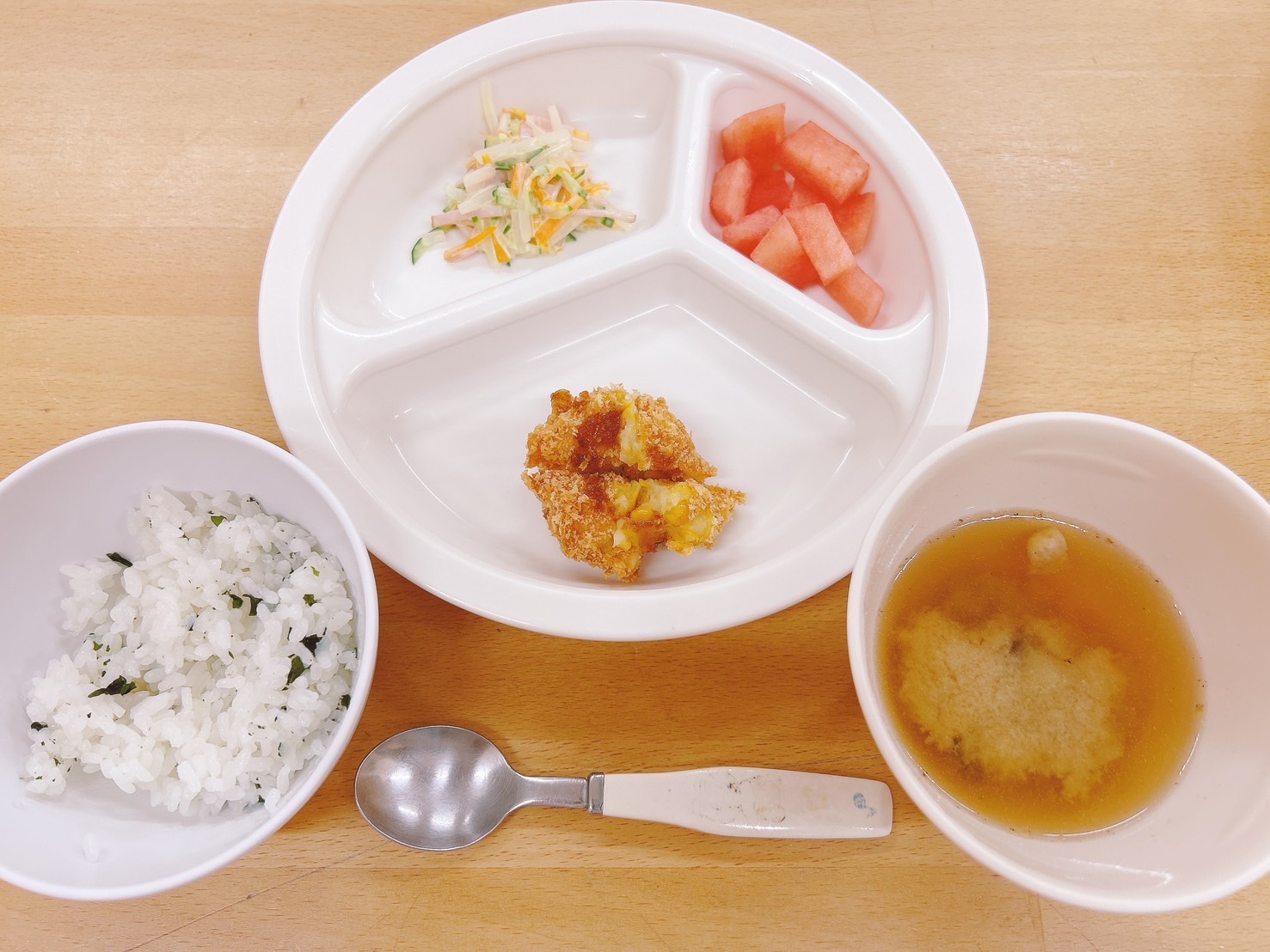 在園児向けのお知らせ 令和7年8月20日(水) 2025.08.20 🍚今日のお給食🍚 わかめご飯 たっぷりコーンコロッケ🌽 春雨サラダ みそ汁 すいか🍉 《1・2歳児クラス》 《0歳児クラス》 🍎今日の一枚🍎 🍌今日のおやつ🍌 牛乳・バナナ この記事のタイトルとURLをコピーする 令和7年8月19日(火) 前の記事 令和7年8月21日(木) 次の記事