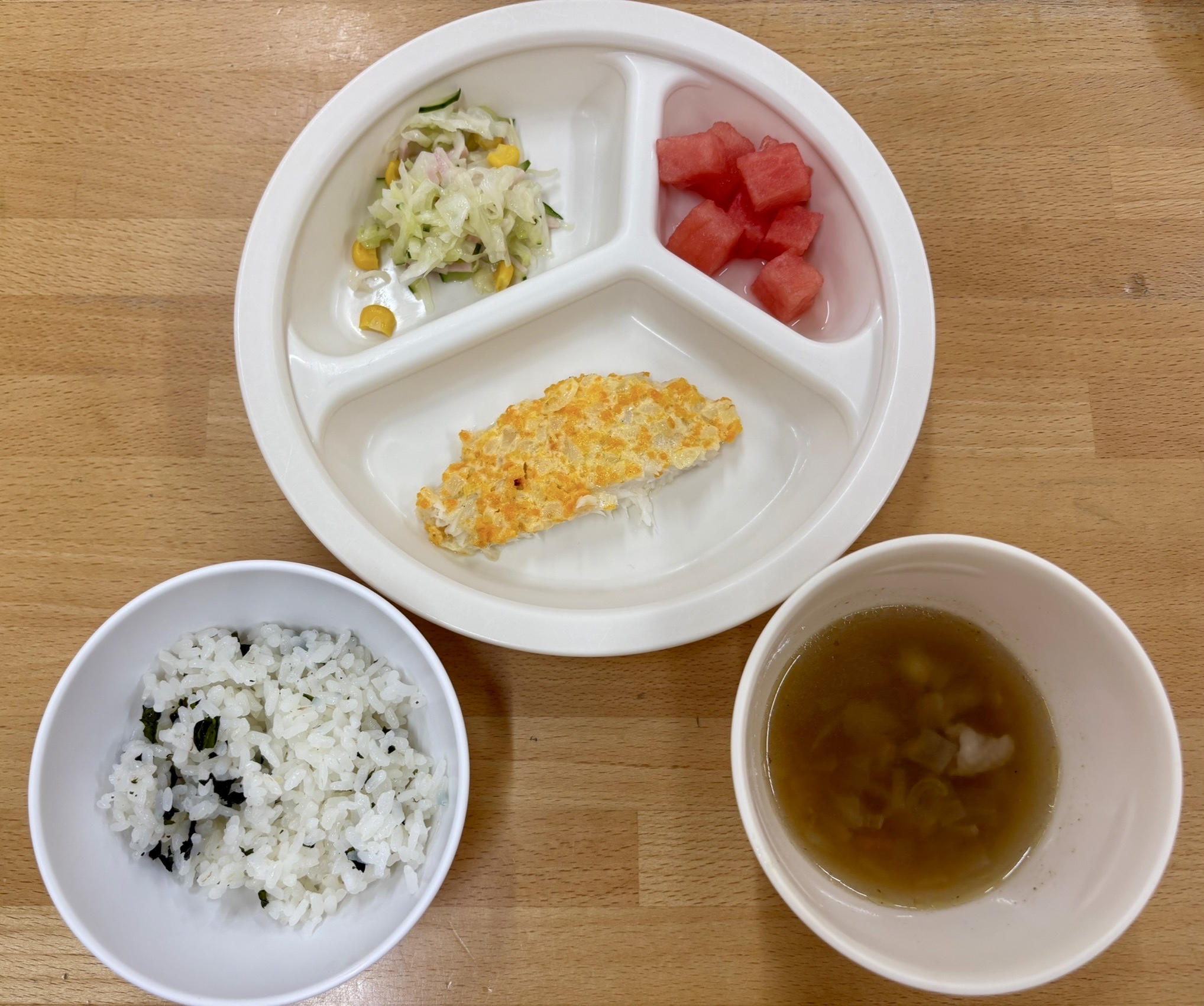 在園児向けのお知らせ 令和7年9月4日(木) 2025.09.04 🍚今日のお給食🍚 わかめご飯 白身魚のキャロマヨ焼き コーンサラダ🌽 けんちん汁 すいか🍉 《1.2歳児クラス》 《0歳児クラス》 🍒今日のおやつ🍒 牛乳・菓子 この記事のタイトルとURLをコピーする 令和7年9月3日(水) 前の記事 令和7年9月5日(金) 次の記事