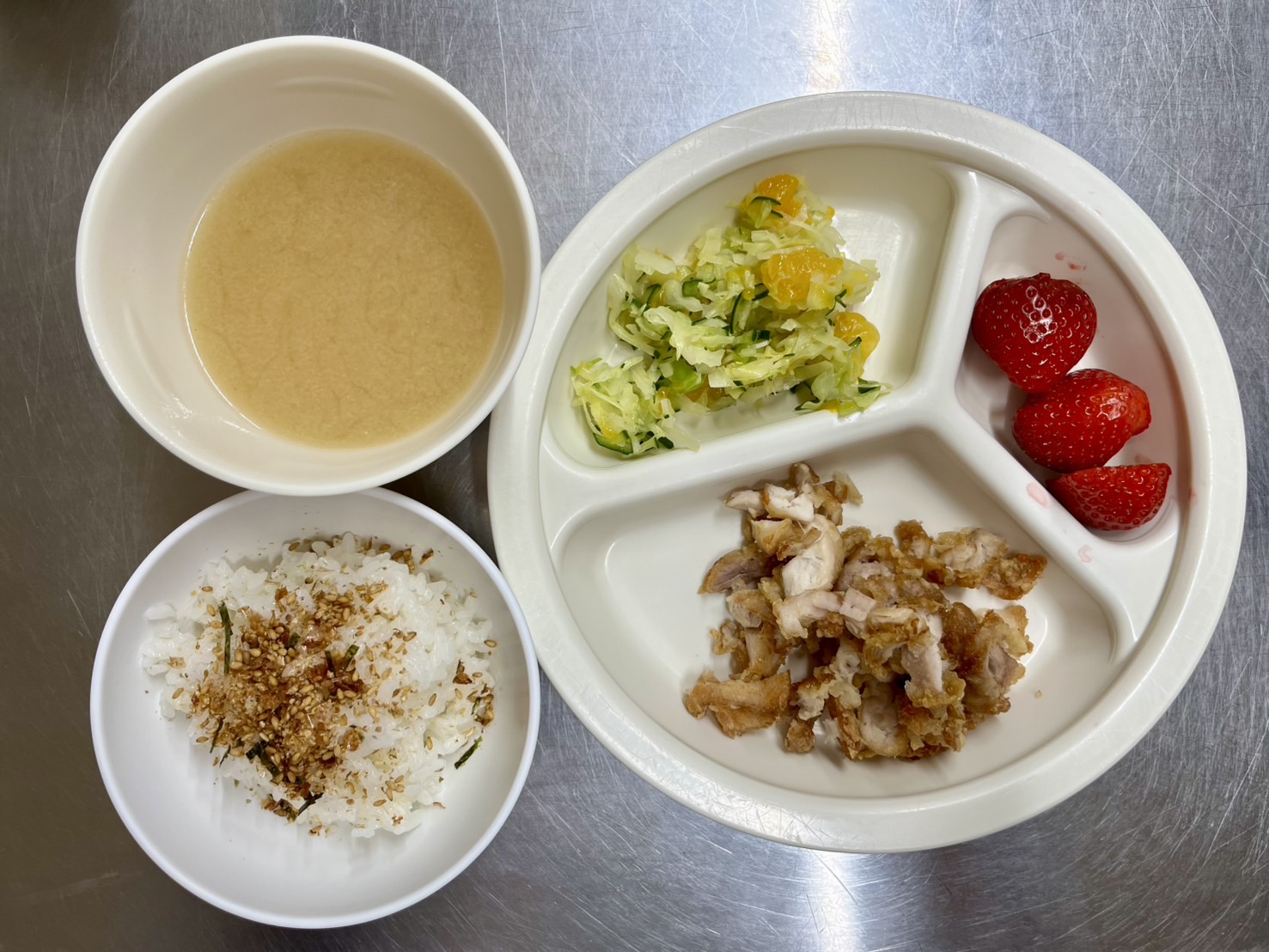 在園児向けのお知らせ 令和8年1月28日(水) 2026.01.28 🍚今日のお給食🍚 ふりかけごはん 鶏の唐揚げ みかんサラダ みそ汁 いちご🍓 《1・2歳児クラス》 《0歳児クラス》 ❄️今日の一枚❄️ 🍘今日のおやつ🍘 フルーチェ・菓子 この記事のタイトルとURLをコピーする 令和8年1月27日(火) 前の記事 令和8年1月30日(金) 次の記事
