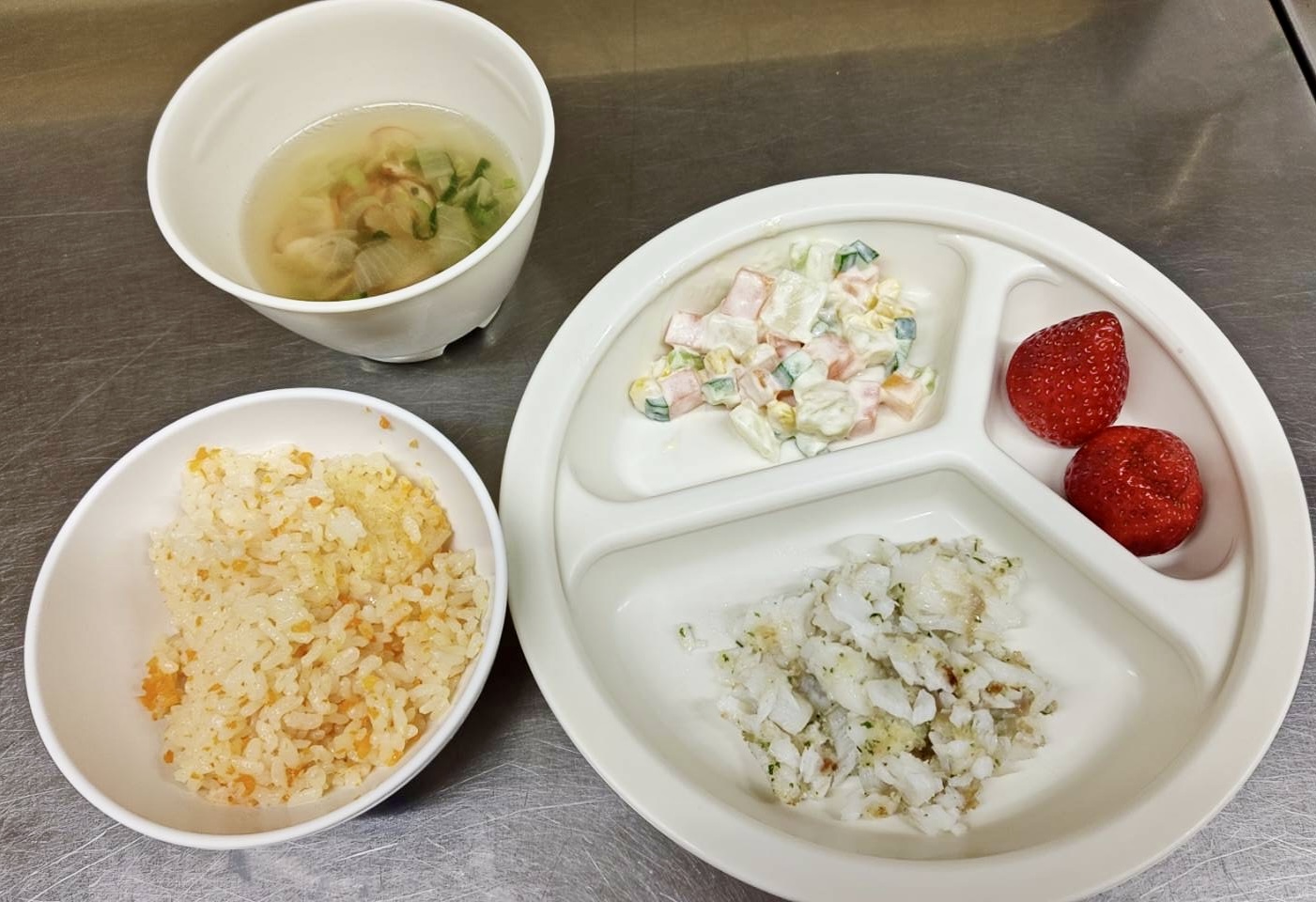 在園児向けのお知らせ 令和8年3月25日(水) 2026.03.25 🍚今日のお給食🍚 キャロットライス 白身魚の香りパン粉焼 マセドアンサラダ 野菜スープ いちご🍓 《1・2歳児クラス》 《0歳児クラス》 ❄️今日の一枚❄️ 🍘今日のおやつ🍘 菓子・牛乳🥛 この記事のタイトルとURLをコピーする 令和8年3月24日(火) 前の記事 令和8年3月26日(木) 次の記事